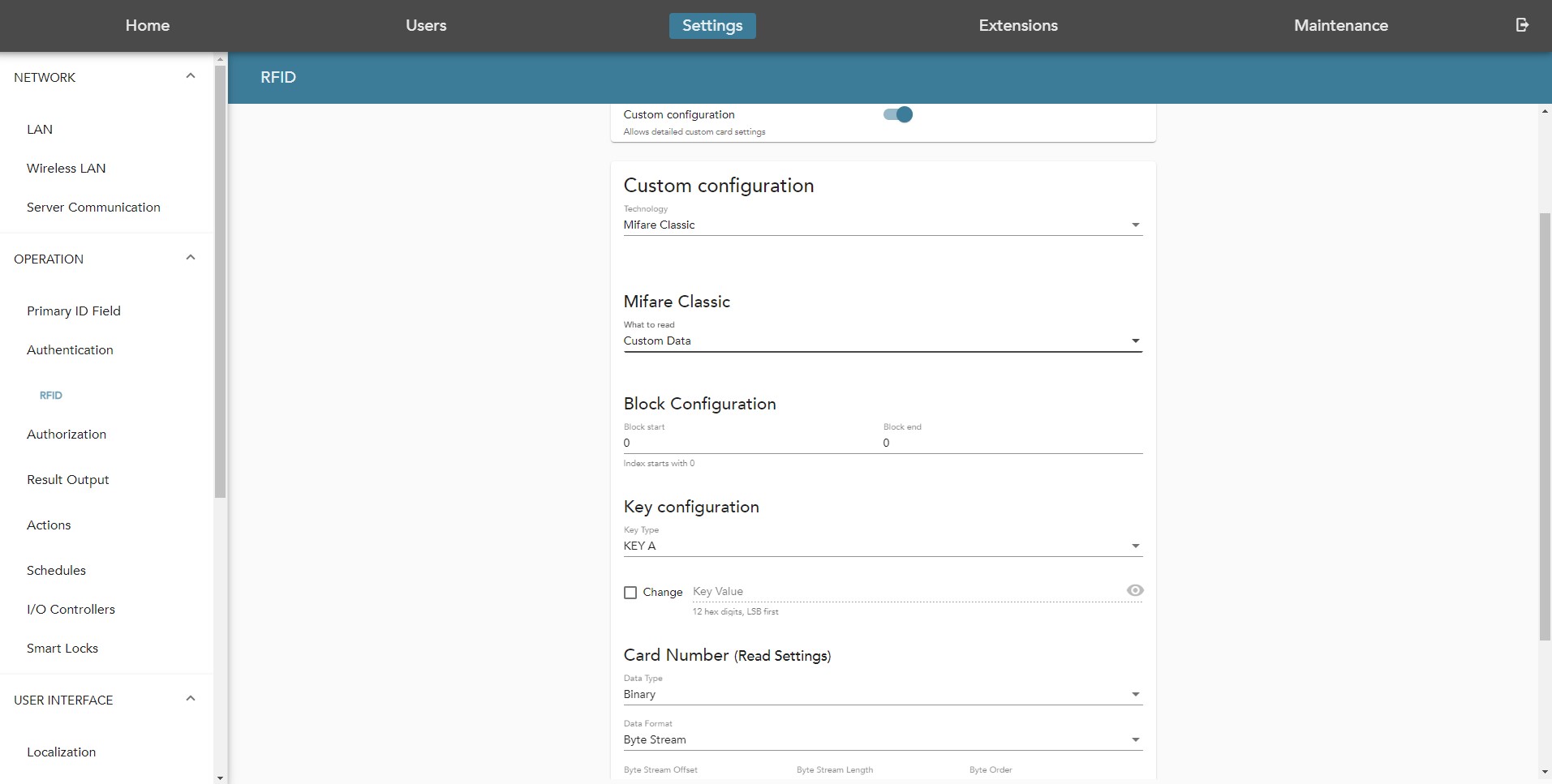 The RFID custom configuration can be enabled under Device Settings/RFID page. The detailed configuration can be set in the sub-menu that appears below. Please note that the sub-menu is displayed only when Advanced settings are enabled.