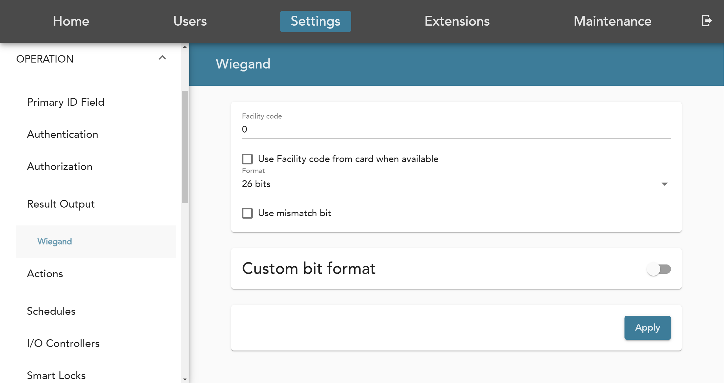 To enable the IO authorization for Wiegand, go to DeviceConfig interface, under 'Settings - Authorization', activate the slider for 'I/O' then click apply.
